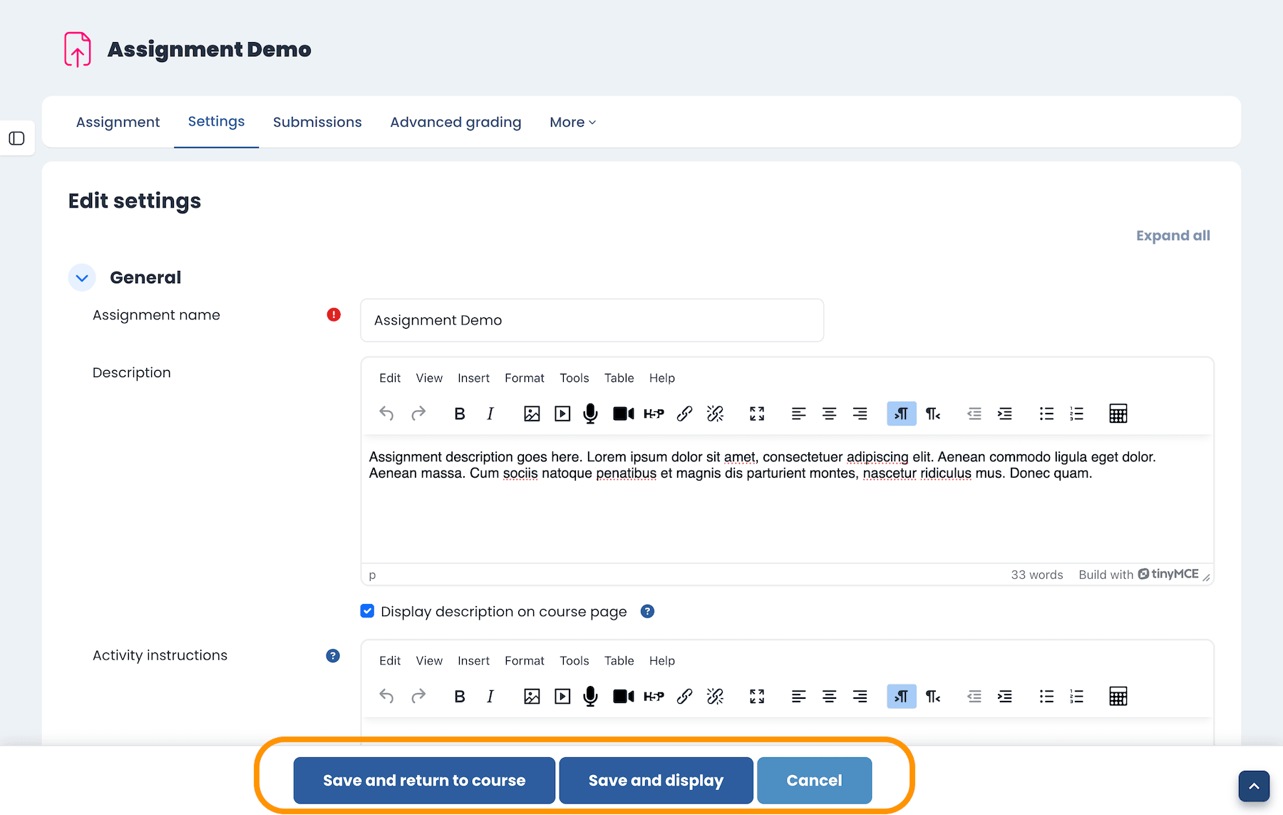 When editing an activity or resource, the action buttons now stay visible in a sticky footer as you scroll. That includes Save, Save and display, and Cancel.